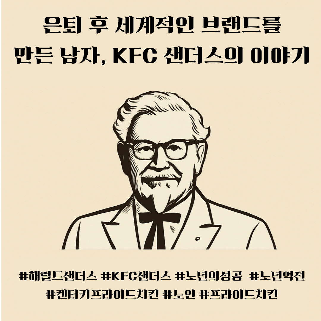 오늘날 전 세계 어디서든 볼 수 있는 KFC, 그 상징인 흰 수염의 '치킨 할아버지'가 바로 할랜드 데이비드 샌더스(Harland David Sanders)입니다. 하지만 그는 처음부터 성공한 인물이 아니었습니다. 젊은 시절 그는 기차역 급사, 보험 외판원, 주유소 운영자, 군 복무 등 무려 수십 개의 직업을 전전하며 평범하거나 실패한 삶을 살아왔습니다. 인생의 대부분을 실패와 가난 속에서 보낸 그는, 65세가 되던 해에 결국 은퇴하고, 매달 미국 정부로부터 연금 105달러를 받으며 삶을 마무리하려 했죠. 그러나 그는 거기서 멈추지 않았습니다. "아직 할 수 있는 게 있다"는 작은 믿음이 그를 다시 움직이게 했고, 바로 그 믿음이 전설의 시작이 되었습니다.